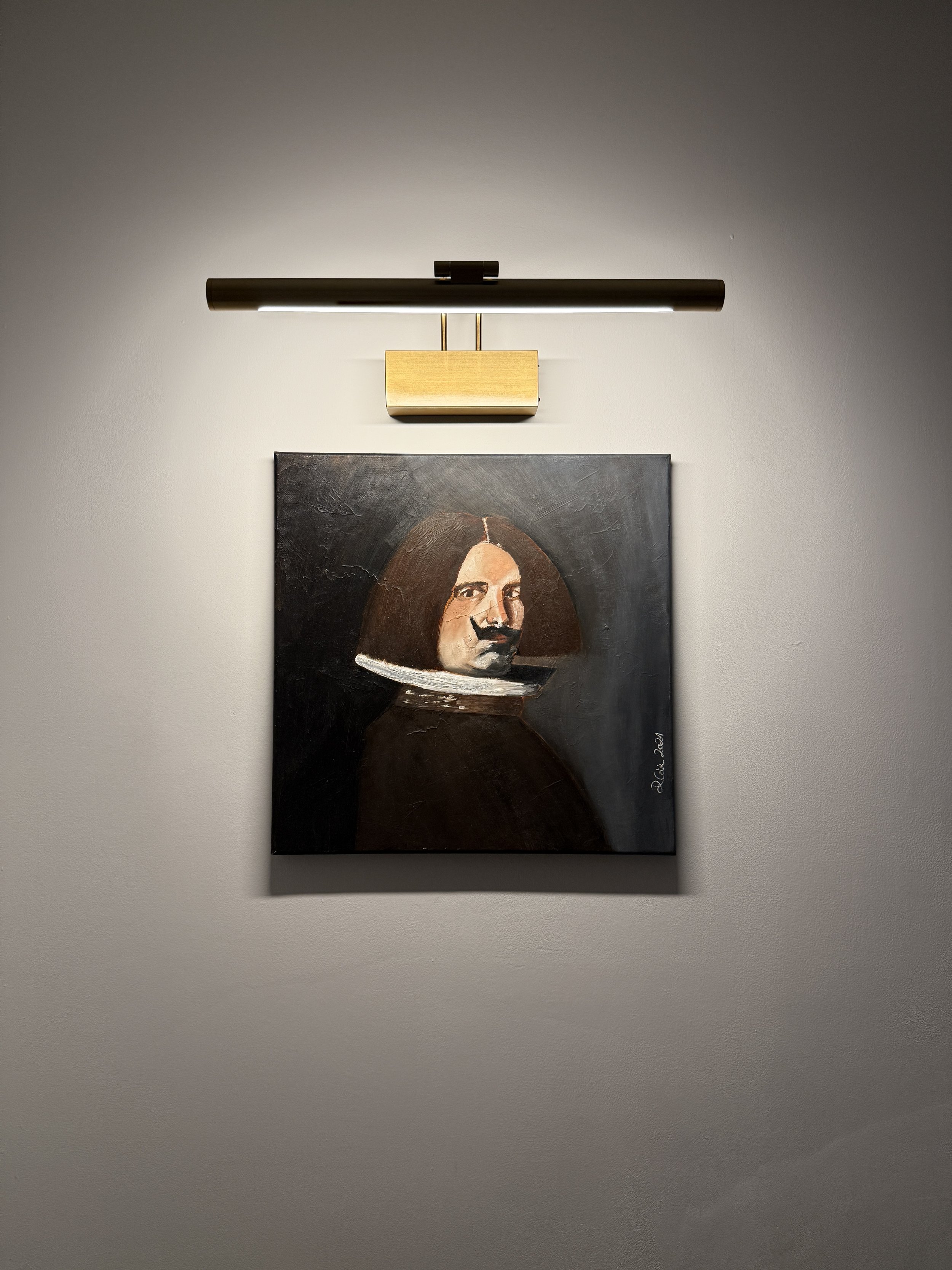 Velázquez 2.0 ist eine moderne Hommage an die klassische Porträtkunst. Mit kraftvollen Pinselstrichen, starken Kontrasten und einer minimaoistischen Farbpalette verbindet das Werk Tradition und Gegenwart. Der vertraute Blick des Porträtierten erhält hier eine neue, zeitgenössische Energie- ein Dialog zwischen Vergangenheit und jetzt.