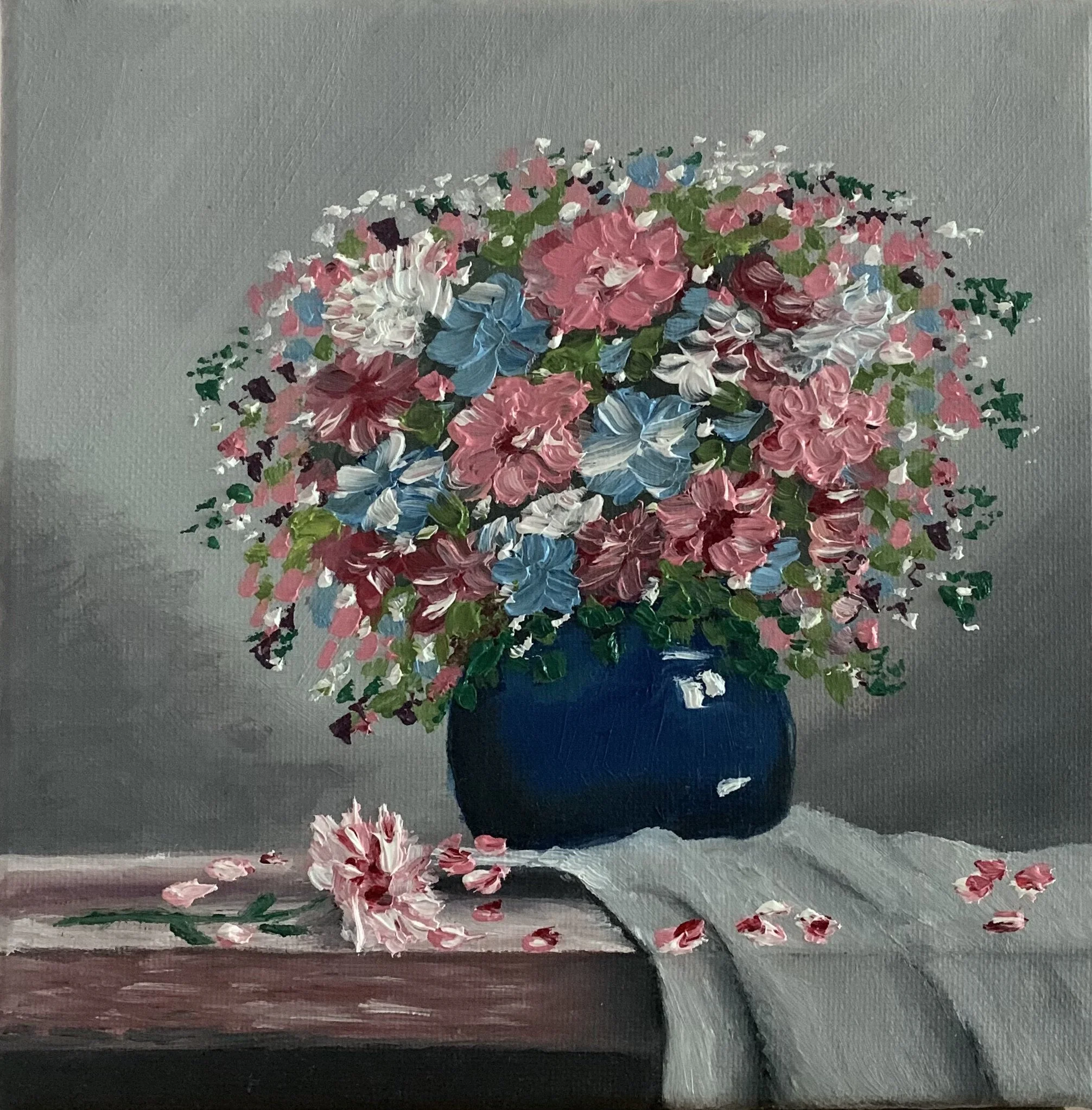 Ein stiller Moment voller Farbe und Leben. Die Pastosen Pinselstriche verleihen den Blumen Tiefe und Bewegung, während der schlichte Hintergrund die Leuchtkraft der Farben betont. Die einzelne Blüte auf dem Tisch erzählt von Vergänglichkeit und erinnert zugleich an den ewigen Kreislauf der Natur.