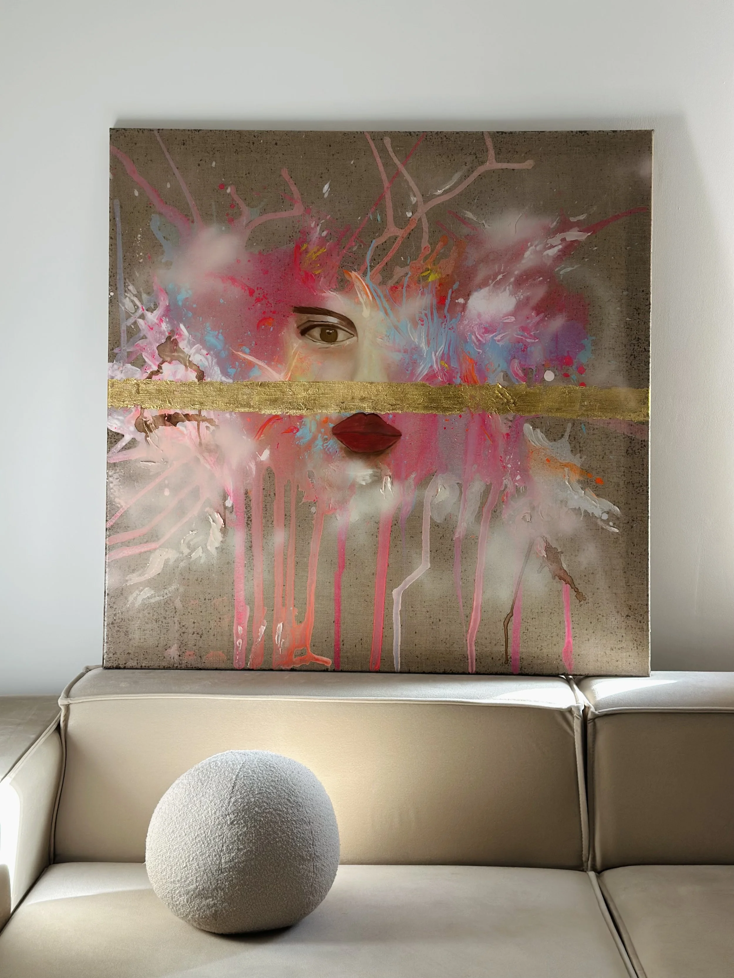 Mit einer Mischung aus Acryl, Öl, Spray und Blattgold entsteht eine lebendige Textur, die Bewegung und Tiefe vermittelt. Das Gemälde lädt den Betrachter ein, über Identität, Emotion und Wahrnehmung nachzudenken – über das, was gezeigt und das, was verborgen bleibt.