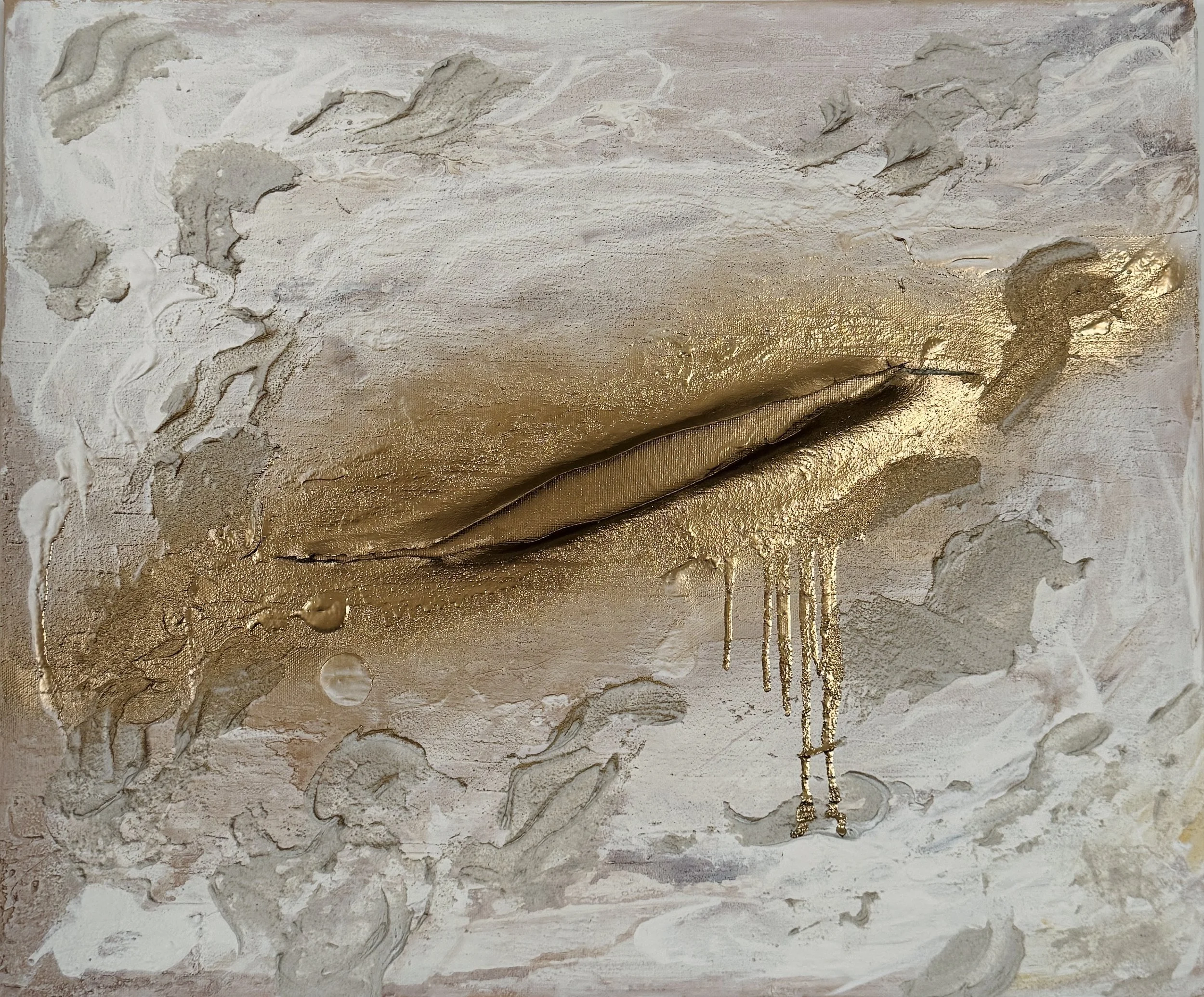 Mit einer Kombination aus Acryl, Strukturpaste und Gold entsteht eine Oberfläche, die Bewegung und Stille zugleich ausdrückt.
